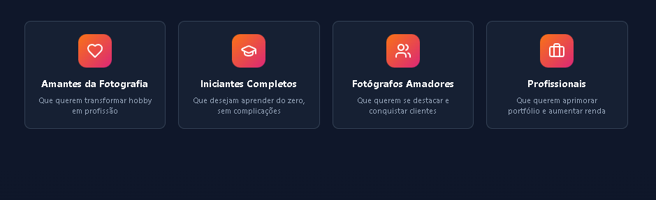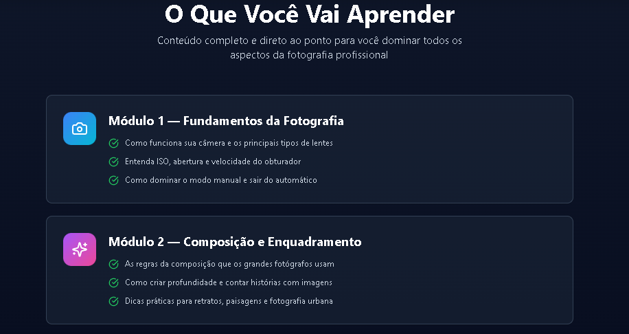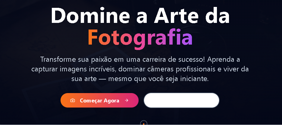 Com o curso “Dominando a Arte da Fotografia”, você vai descobrir o passo a passo completo para se tornar um fotógrafo profissional, dominar técnicas de luz, enquadramento, composição e edição — e ainda aprender a vender suas fotos e serviços com autoridade no mercado.